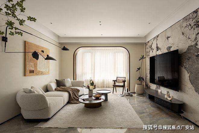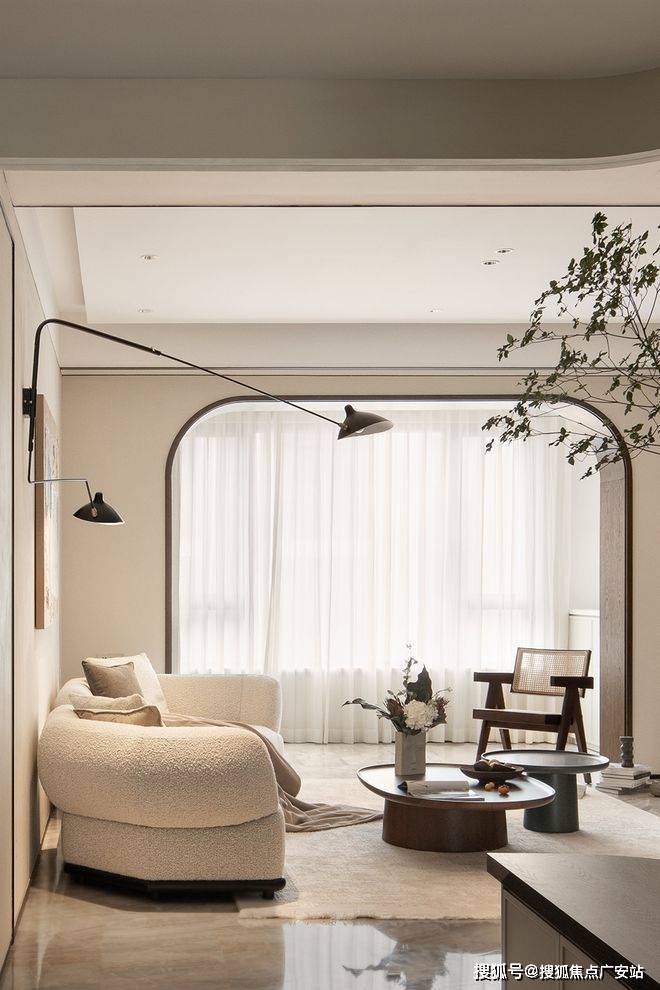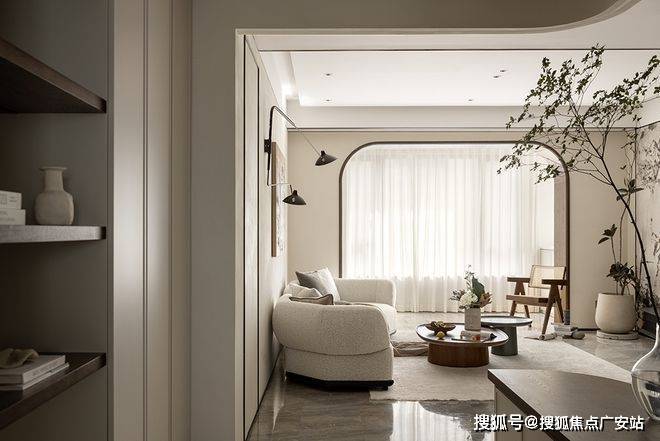 挑高扇形弧度造型、内置收纳玄关柜,与自然质感的材质虚实结合,绿植与灯光的适度渲染。