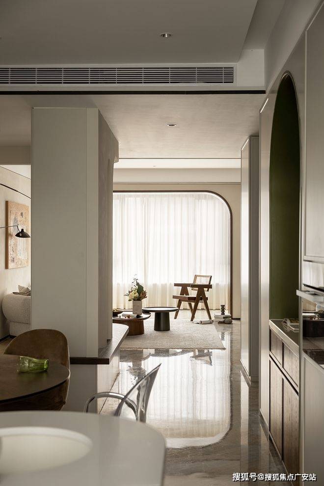厨餐厅,内置双拱门造型,利用空间穿插、错景,划分餐厅与西厨区,开放互动气质与当代审美相结合,隔而不断,界而未界,留给空间更多的想象和延伸。