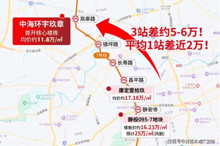 环宇玖章与17.18万/㎡的康定壹拾玖只差3站,但这3站均价却差5-6万/㎡。