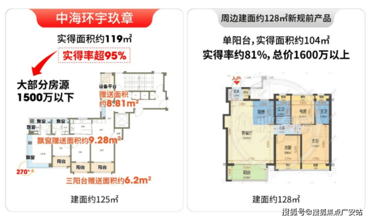 环宇玖章125户型实得率超95%,而宝华项目实得率仅约80%。按同等实用面积折算,环宇玖章实际单价就更划算,仅约10万/㎡。