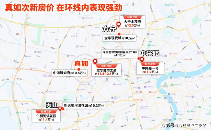 值得注意,目前真如、大宁、天山的次新房价基本持平,普遍在10-12万/㎡区间,说明这些板块当下的市场价值相近。