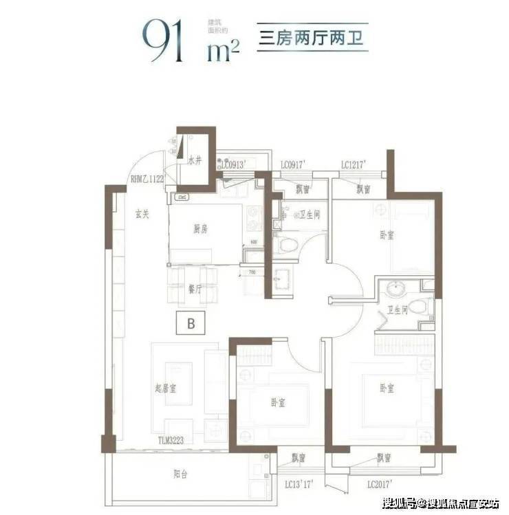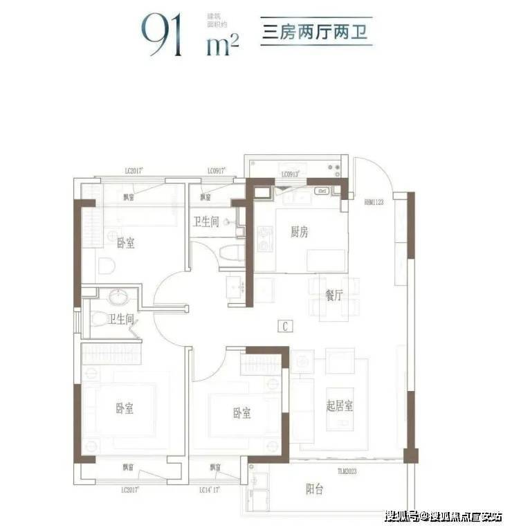 91㎡ 三房两厅两卫(高层爆款):382 万起,三开间朝南、南北通透、大阳台