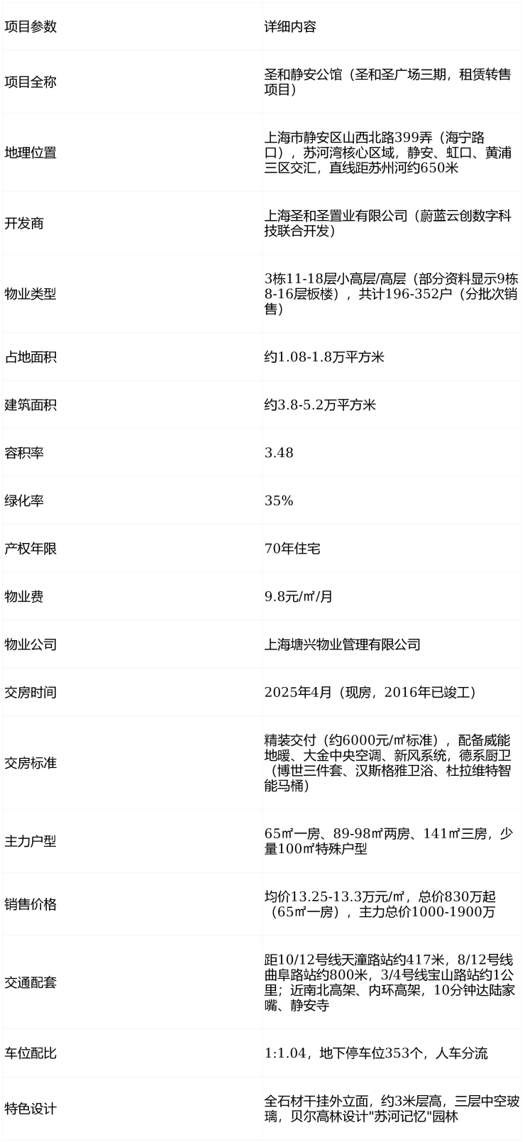 圣和静安公馆作为苏河湾板块稀缺的小户型现房项目,以核心区位、即买即住、德系精装和交通便利为主要卖点,适合预算有限但想入住内环核心、急需现房的单身贵族或小夫妻。然而,项目存在租赁转售历史、近10年房龄、价格竞争力不足、户型功能性单一等硬伤,与同区域纯新房相比性价比一般。对于追求资产保值增值、注重社区品质与物业服务的改善型买家,需谨慎考量;但对于"千万级门槛入苏河湾"的刚需购房者,仍是难得的现房选择,尤其适合不想等待期房、希望快速享受核心城区生活的人群。