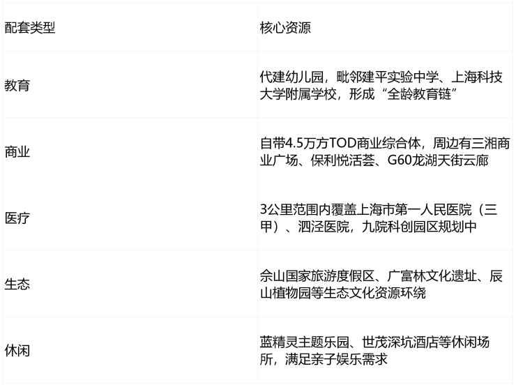 全龄段教育闭环:周边3公里内覆盖多所优质学校,包括上海外国语大学松江附属学校(规划中)、松江大学城等,形成"全龄教育链",满足从幼儿园到大学的教育需求