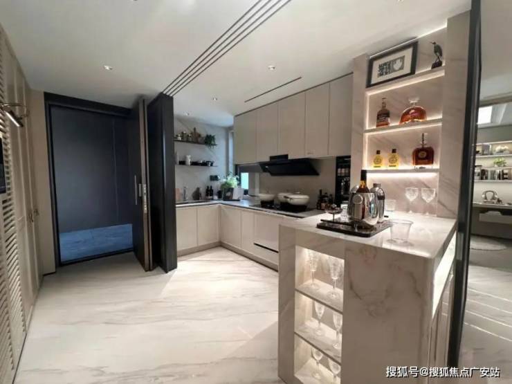 113平户型,进门就是入户的玄关柜,宽U型的厨房设计+全新升级岛台,使得整个操作空间更为宽裕,扩大实际使用中的活动半径。