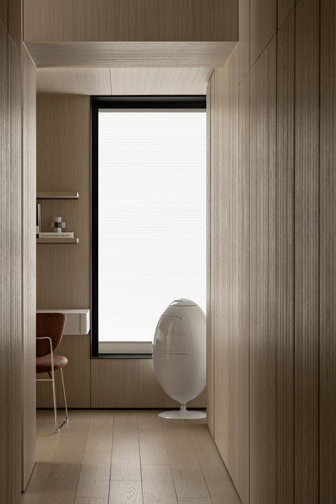 作为入户第一幕,玄关以极简姿态开启生活叙事,素净墙面如天然画布。清透支架托举着素白花瓶,植物姿态俏皮延展,成为连接户外与生活的温柔过渡。