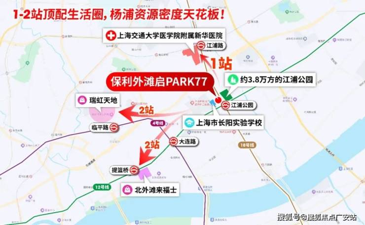 更难得的是,1-2站范围内,三甲新华医院、北外滩来福士、瑞虹商圈、江浦公园、长阳实验学校等顶配资源一应俱全。