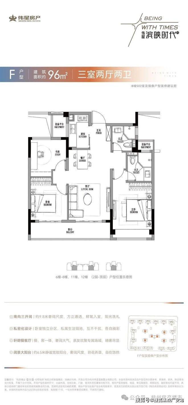 96㎡:三室两厅两卫,总价约175.5万起,主卧朝南