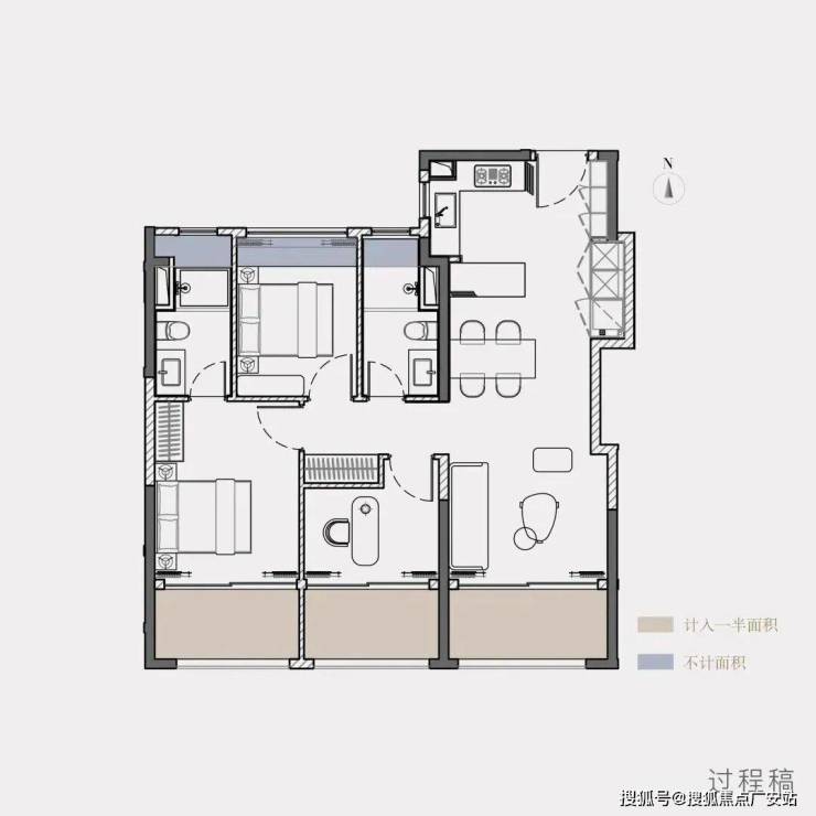 以约 108㎡户型为例,其 “逆天三朝南阳台” 设计,不仅让实得率拉满,更实现了 “无敌采光视野”—— 三开间朝南搭配多阳台,让阳光充分涌入室内,每一个空间都能享受到通透明亮的居住体验,将 “理想生活” 落到每一处细节里。