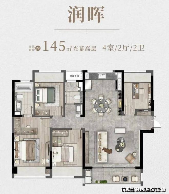 主力户型:3 室 2 厅 2 卫(建面 110㎡)、4 室 2 厅 2 卫(建面 145㎡)、4 室 2 厅 3 卫(建面 168㎡)