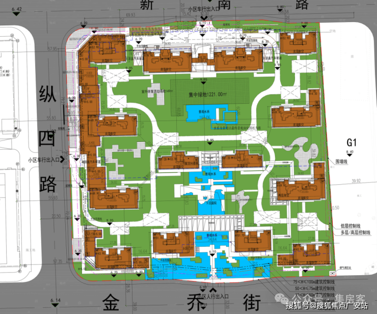 从设计图上看,这个小区地面布置了大量的景观水系。南面主入口的小区门厅外,就做了大面积的对称水景,穿过大门后,又是下沉庭院和景观水系,整体连贯铺陈,仿佛湖中小岛。