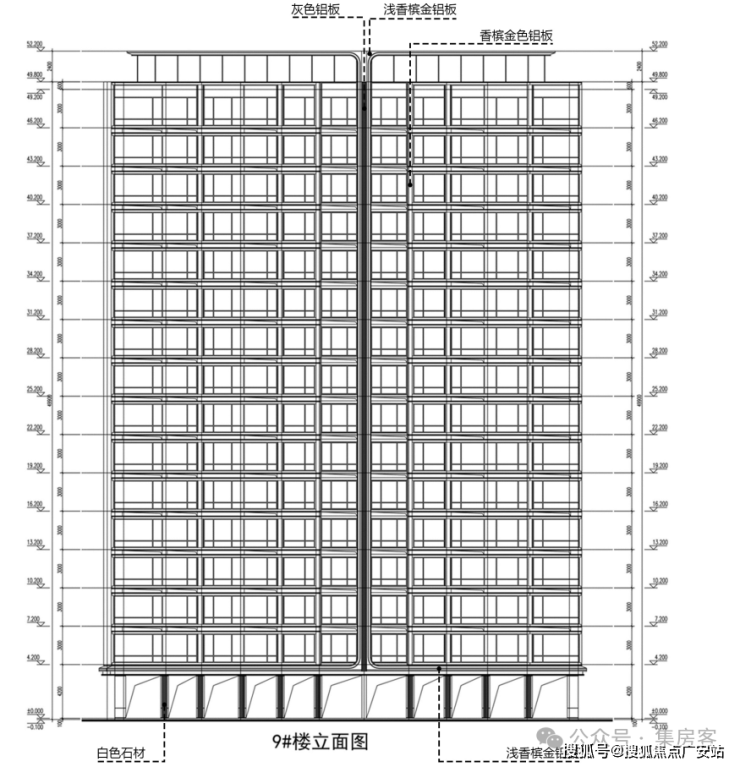 住宅基座浅香槟金铝板搭配白色石材;立面为香槟金色铝板、灰色铝板及浅香槟金铝板。