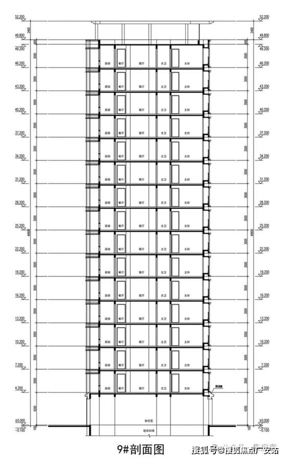 以9幢住宅(16F)为例,住宅架空层层高4.2米,住宅标准层层高3米。