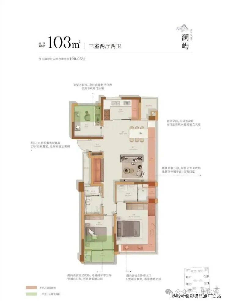 最大得房率约100%,通过最大化飘窗、可拓展阳台、LDKB一体化布局实现"公摊归0",突破传统尺度局限