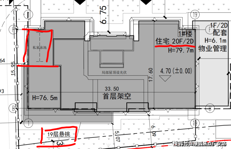 该方案亮点颇多,总计八幢高层和小高层设计,最南端的1#和2#楼均设置有私家泳池,而且还在19F采用了住宅楼当中较为少见的悬挑工艺,延伸出了一定的使用空间,个人预估这两幢会是配置大平层豪宅产品。