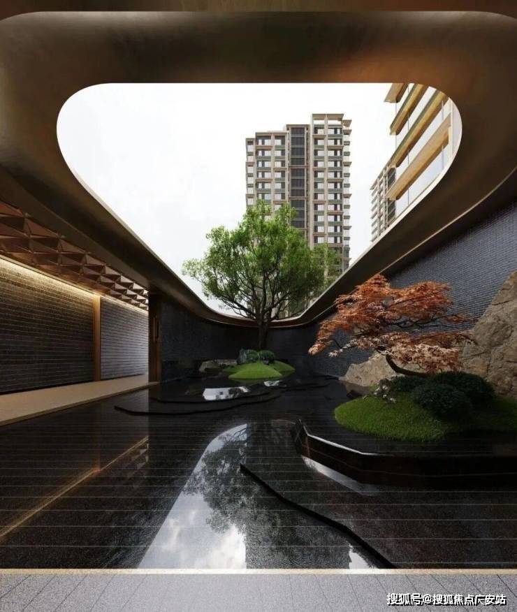 山水长卷的隐奢门庭:取意豫园中式园韵,打造约99米隐奢入口空间结合独立的车马院,风雨廊道与人车分流独立双入口,带来尊贵的归家体验。