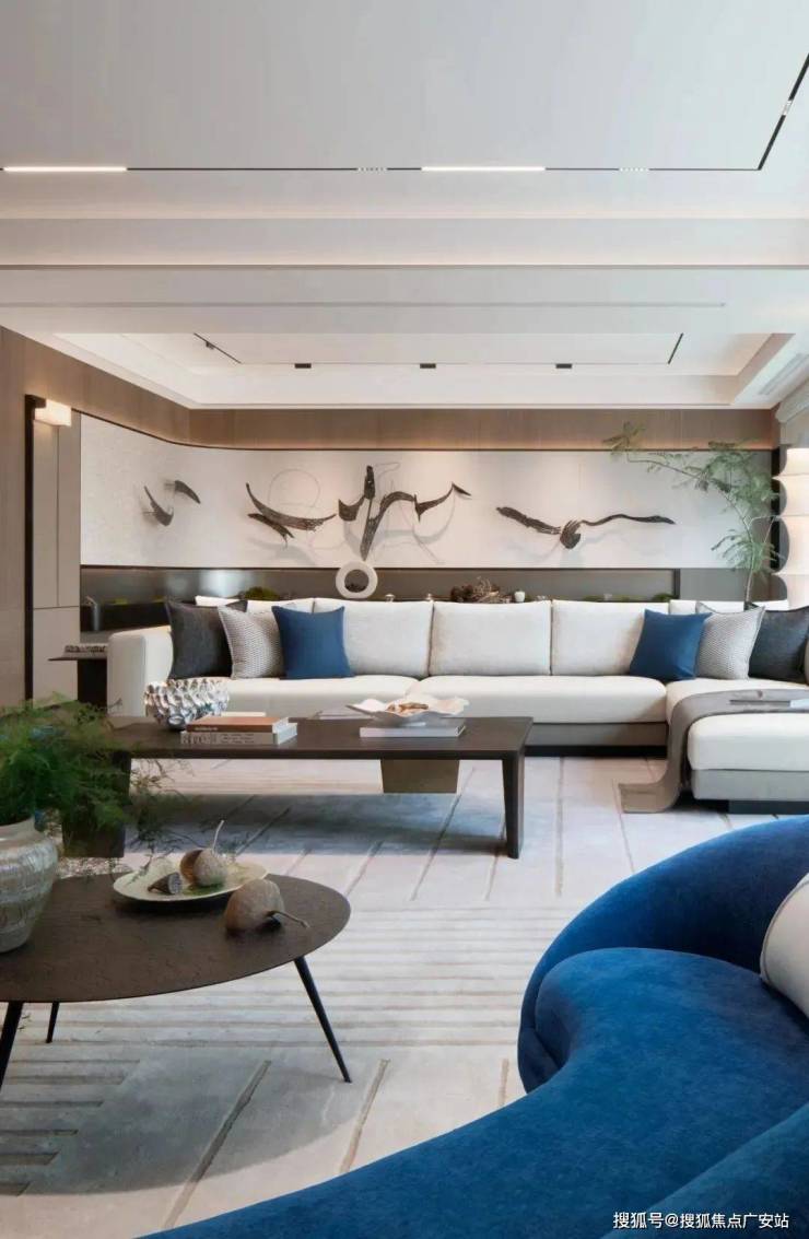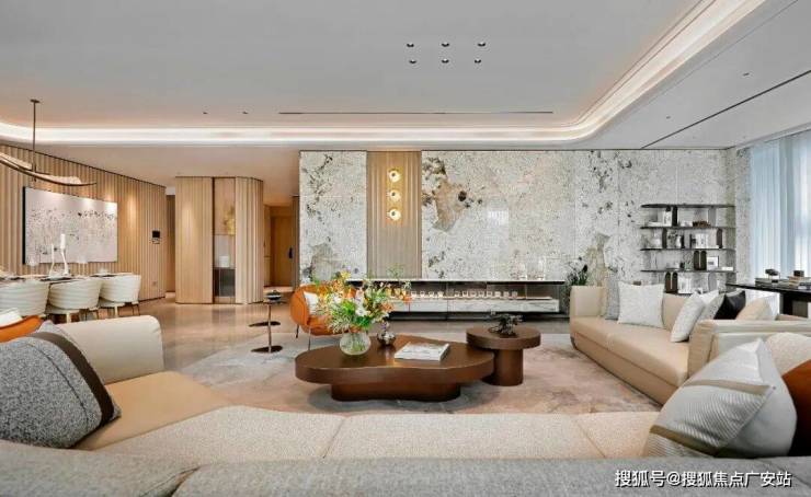 东区建面约320户型,将艺术感进一步融入日常中。特别设计的专属门厅空间,是从电梯厅延伸到家,如同一处艺廊,放慢人的情绪;室内选用了浅金色奢石(外界也称其为“芬迪白大理石”)作为主要的石材,曲面的木饰面也为浅色,整体给人以明亮感。