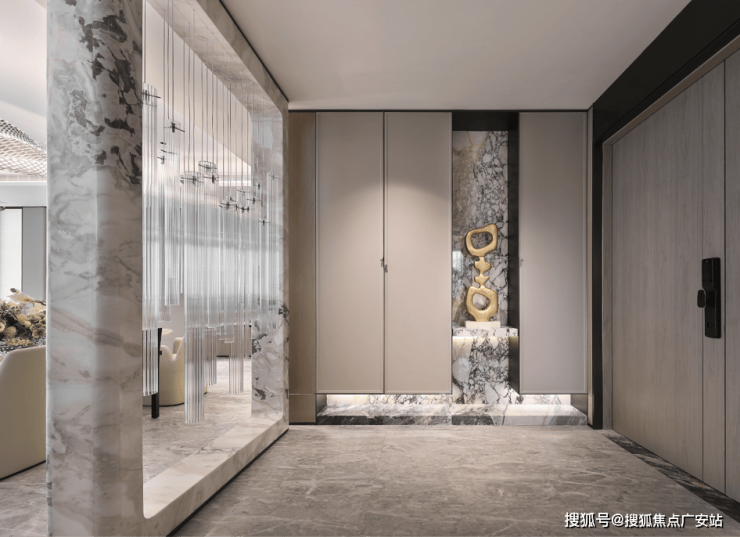 户型格局上,基本做成了类一梯一户格局,一层两户两部电梯,彼此都拥有独立的入户门厅。进门是大空间玄关区,与之搭配的辅料,有皮革、山水纹理大理石、瓦楞玻璃、仿古铜金属等,时而明澈,时而苍劲。米白色石材和温润的木质面犹如一个盛在东方意蕴的艺术品。