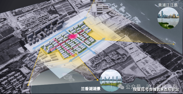 洋房分布在东西两侧,东侧洋房可俯瞰黄浦江江景及滨水绿地,西侧洋房可览兰香湖湖景。