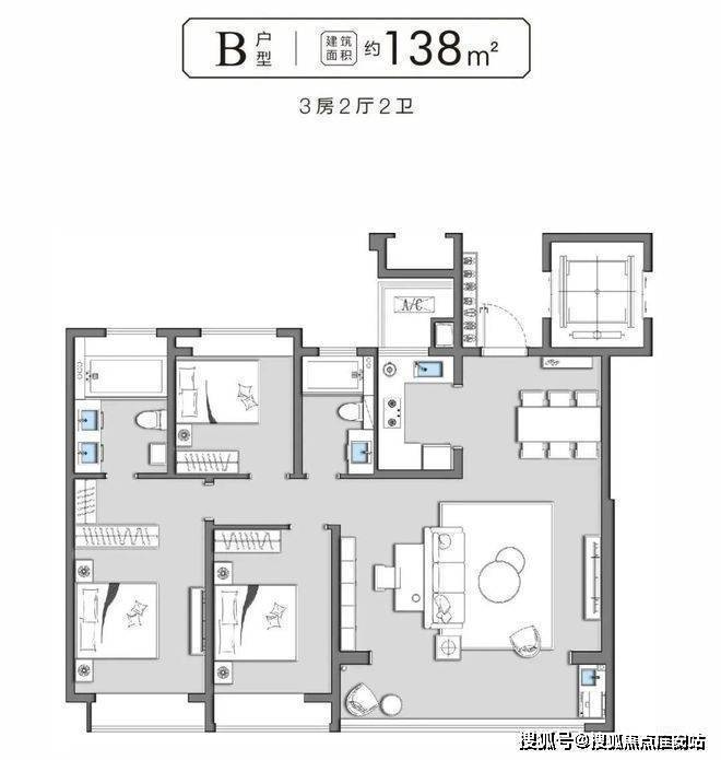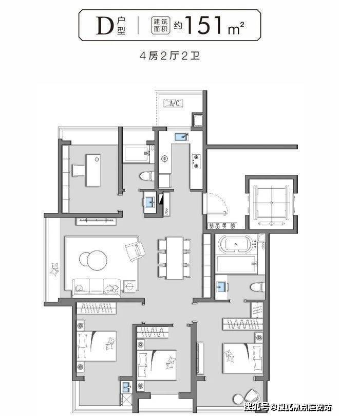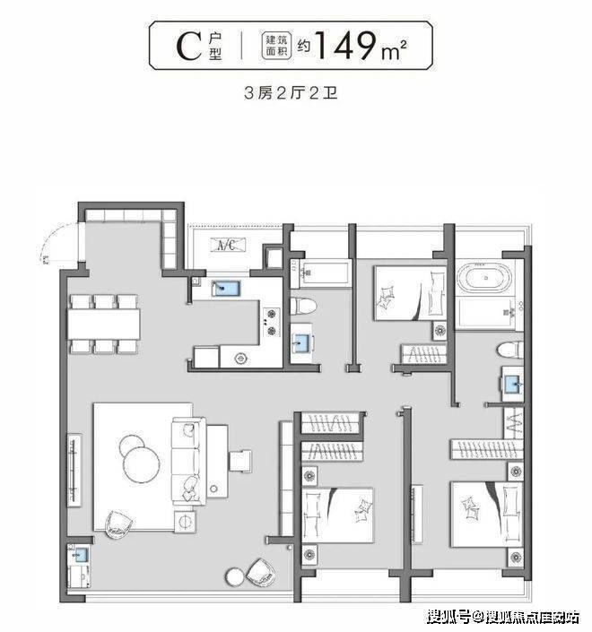 149㎡可能是项目最好的户型,小横厅,3房朝南,但南北不是特别通透。