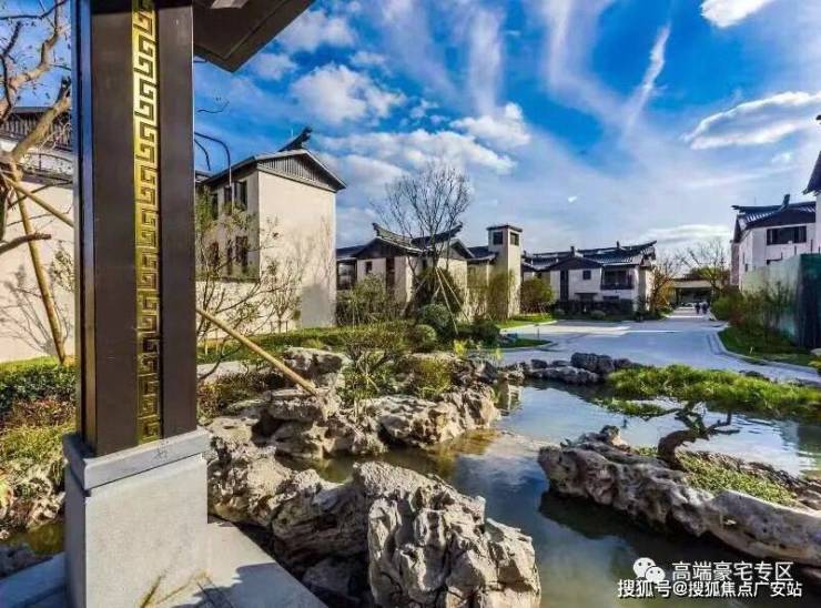白墙黑瓦的视觉风格,中轴对称的大气格局,高地错落建筑造型,辅以亭台、叠水、乔木等中式景观布局,营造浓厚的中式宅院体验感。