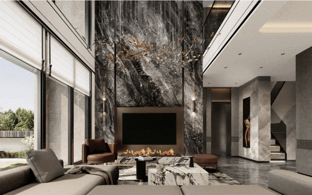 整个立面,利用浅灰色玻璃、香槟色金属格栅、铝板、干挂石材与顶部的深灰色瓦片相结合,为别墅注入了一份沉稳与大气,令人眼前一亮。