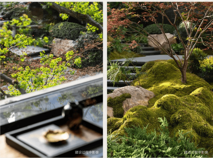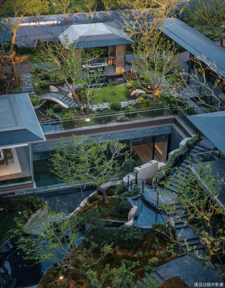 而最令人惊艳的,当属约6米地势差打造的下沉式山水庭院,山、石、水、林有序交织,犹如一幅“豁然开朗山水轴卷,每一步皆是景致,每一处皆有不同。