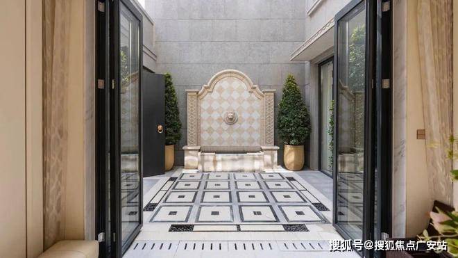 项目内部围合起近3000㎡的开放式绿地,借鉴海派大都会园林的的摩登、精致、艺术、惬意之精髓,以水为径、以形为礼、以园为厅,打造情景交融的塔尖圈层社区场景。