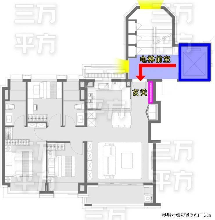 另外一个特别让人感到舒服的地方是电梯轿厢的开门没有和单元里两户的户门直接对视,而是形成一个90度的转角,这样增加了对于隐私的保护。