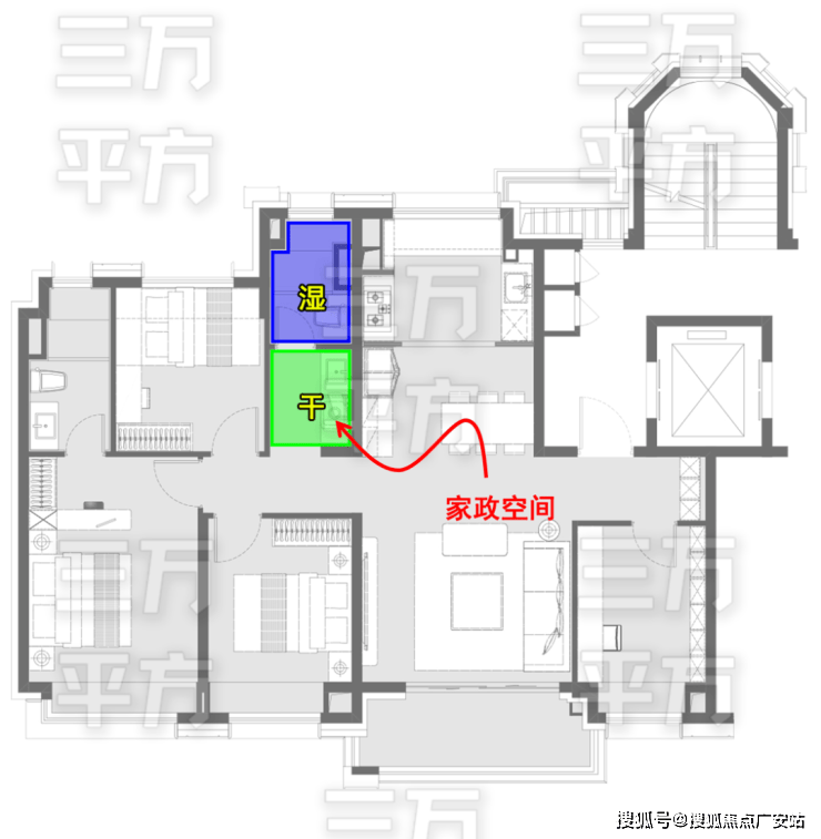 在干区,又很贴心的增加了家政空间!这在功能上布置的太合理了,换洗下来的衣物在边上就能洗涤,便利性一流。