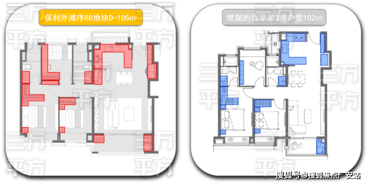 从以上的数据对比可以看出,如此高的空间“使用率”,百平米三房中的“突破级卷王”,【保利•外滩序BUND88】建面约105㎡D户型绝对是名至实归。