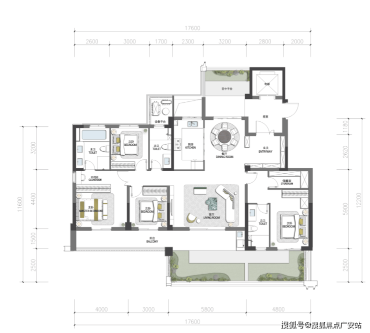 户户空中花园:大平层建面约160-185㎡,一梯一户,以185㎡为例,南向立体庭院开敞10+米,阳台面宽约12米,算上不计面积的部分,得房率惊人。更是将客餐厅、厨房、阳台、花园融合为连续空间,增添生活意趣。