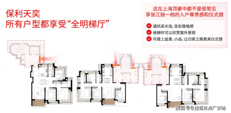 值得关注的是,保利天奕还是全明梯厅。据统计上海700-1000万级新房项目,全明梯厅大部分都是大户型豪宅专属,即便是均价20万的顶豪,也很少实现这种设计。