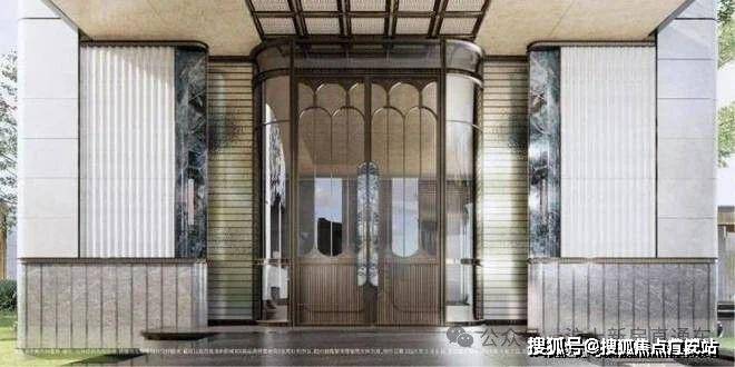 在楼栋主入口同样运用石材+弧形铝板等元素,同时还有格栅装饰,质感提升明显:
