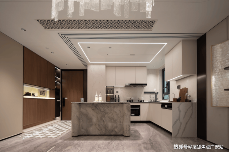 走进海上·清和玺的厨房,墙面岩板通铺,视觉效果超棒。
