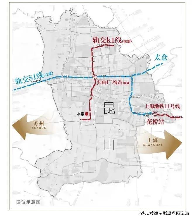 配套设施:【交通】项目距离高铁昆山南站直线距离仅约6公里,规划中的K1线,预计将从项目东侧经过,成为连通南北的轨道交通主干线。K1线未来将在玉山广场站与S1线换乘(规划),可抵达苏州、上海等地,真正实现“三地同城化”。