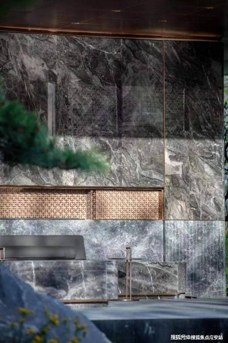 而大华星曜不仅打造了具有曲线美感的树池,还在水景底部铺了数百片蓝钻瓷片,全角度弧形定制,水刀切割,用金属线条勾勒出水波的形状。