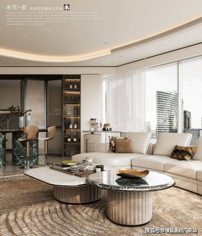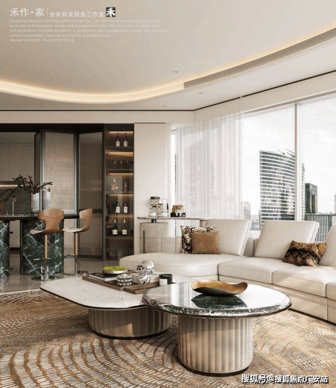 将艺术感进一步融入日常中。特别设计的专属门厅空间,是从电梯厅延伸到家,如同一处艺廊,放慢人的情绪;室内选用了浅金色奢石(外界也称其为“芬迪白大理石”)作为主要的石材,曲面的木饰面也为浅色,整体给人以明亮感。