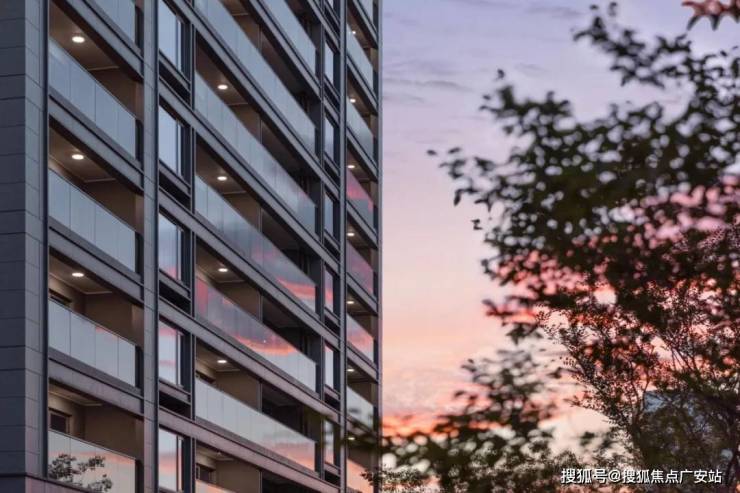 建筑外立面大面玻璃在阳光的映射下熠熠生辉,如明澈眼眸,温柔盛纳流转天光与四季风华,为家披上恒久的光华与静谧,在光阴长河中自成诗行。