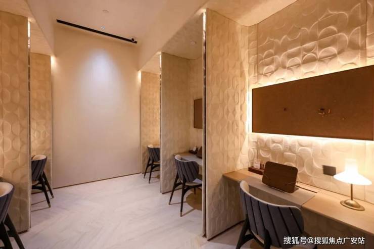 恒温泳池:第一,采用了景德镇烧制的陶瓷马赛克,独特的釉面色彩由景德镇老师傅手工浇筑而成,充满人文艺术底蕴;第二,羽毛天花造型,由600余件铝板打造,表面采用了仿贝壳纹的艺术漆处理,带来松弛度假感;第三,不仅配置了约25m×10m的4道泳池,还采用了奥运会同款空调除湿系统,彰显高档品质细节!