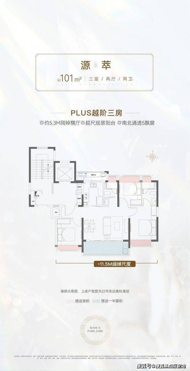 现场开放的是建面约101㎡三房拥有约5.3米横厅,一梯两户设计之外每个房间都设计有飘窗空间更大: