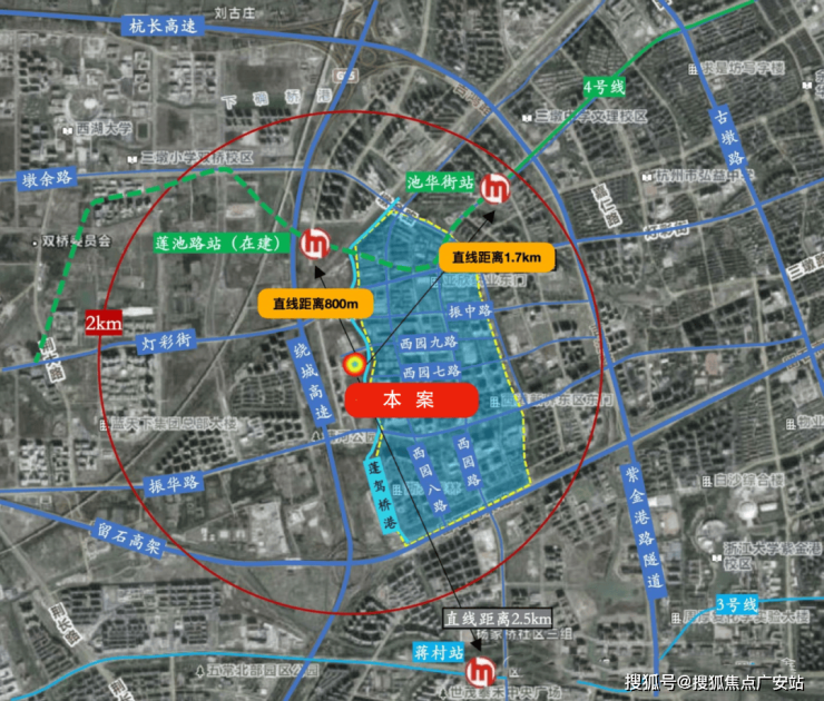 9.正处城西大走廊的起始点紫金港板块,东南约1.5km即为浙大紫金港校区,直线距离建设中的地铁4号线莲池站仅约700m。