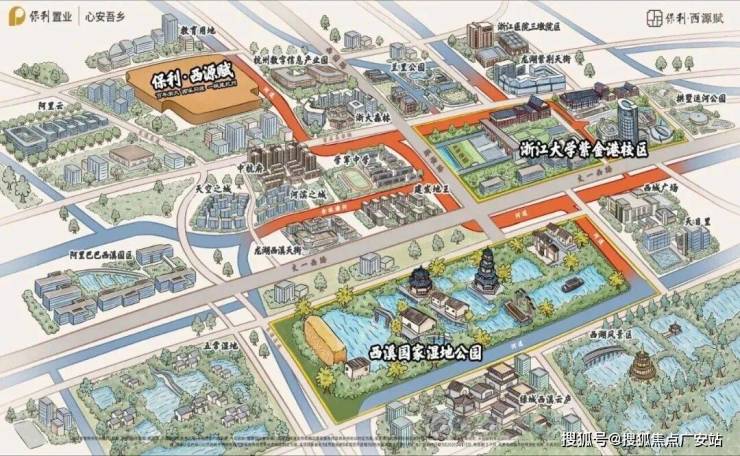 【保利置业·西源赋】是西湖、西溪以北绕城内与蒋村地王并存的唯二新盘。正处城西大走廊的起始点紫金港板块,东南约1.5km即为浙大紫金港校区,直线距离建设中的地铁4号线莲池站仅约660m。
