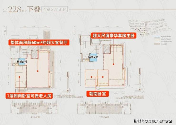 ①建面约228㎡下叠户型详细分析: