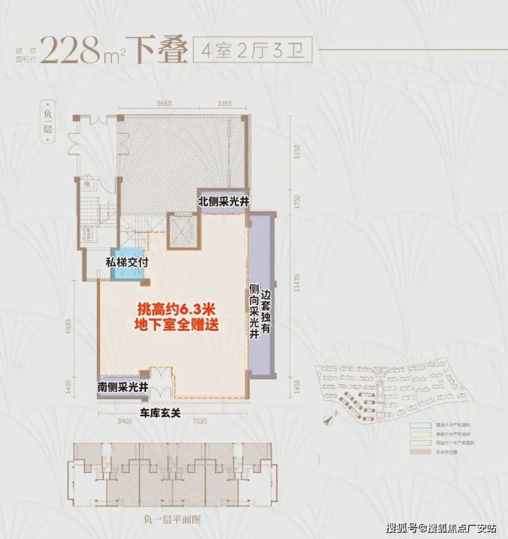 下叠户型地下单层面积约120㎡,层高达约6.3米,可以做双层使用,增加夹层后,地下空间可拓展至超200㎡,丰富的灵动空间足以满足业主的各类喜好!