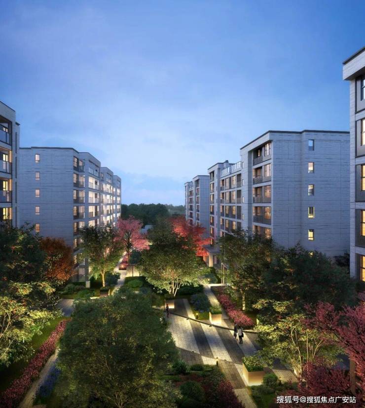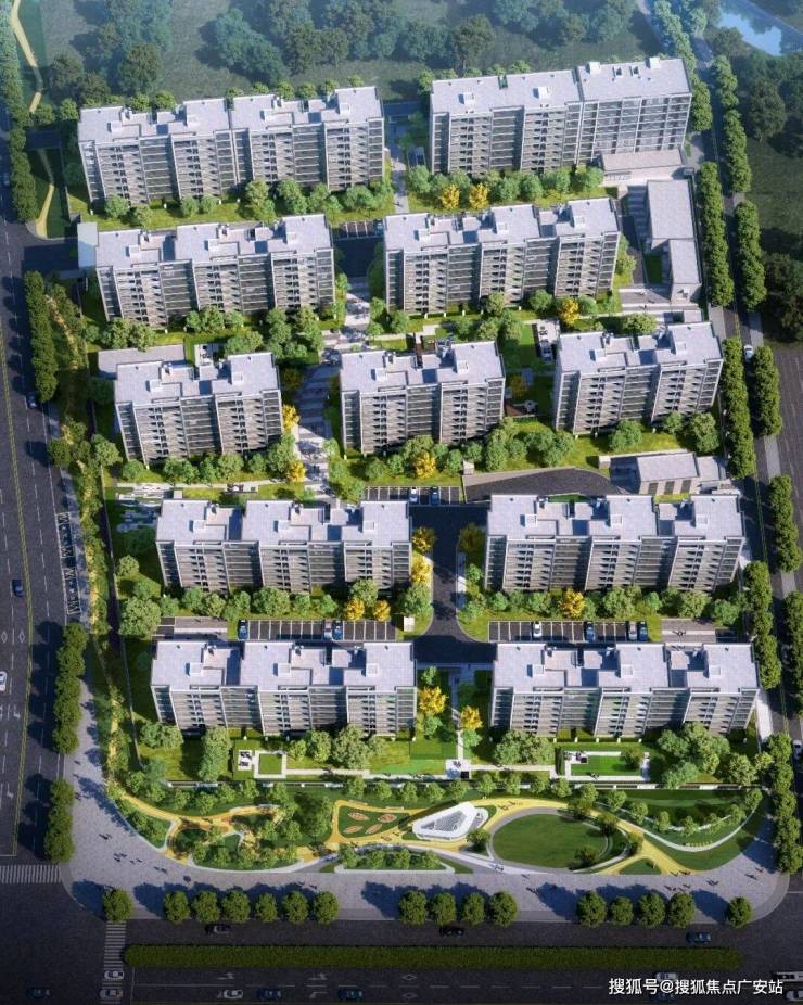 建筑风格:现代简约,外立面石材 + 真石漆,社区景观 “一轴一心一带四组团”
