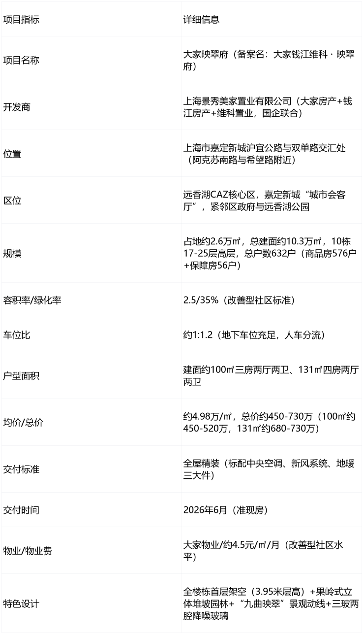 核心速览:项目最大优势在于远香湖CAZ核心区位+杭派精工全架空层+果岭式立体园林+精装三大件+100㎡三开间/131㎡四开间爆款户型+总价450万起,是嘉定新城品质刚改标杆;短板集中在距地铁有距离(11号线约1.5-2公里)+东侧临沪宜公路噪音+含1栋保障房+交付时间2026年6月+部分户型总价达700万,适合嘉定本地改善家庭、看重新城规划与生态环境的购房者,尤其适配在虹桥、嘉定新城工作的人群。