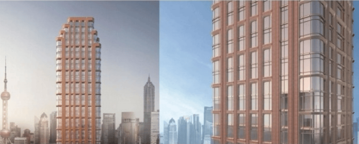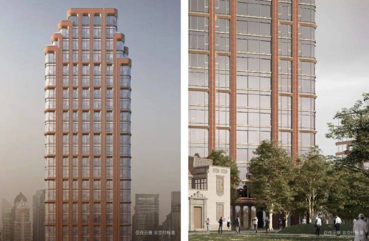 整个建筑的外立面将经典的ArtDeco立面风格与海派文化相结合,用ArtDeco常用的竖向线条来解决高层建筑的挺拔感、用红色陶板来勾勒出海派老洋房的红砖意象,呼应历史、但又符合现代人高级审美。