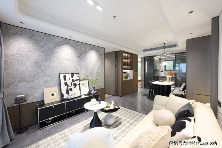 除了精装外,项目还有更多的品质感表现。例如客厅地 面选用的是北京城建国誉府高定的 温德姆灰大理石瓷砖 ;简一大尺寸瓷砖,拼缝仅0.35mm,工艺复杂,几乎无缝,整体性强