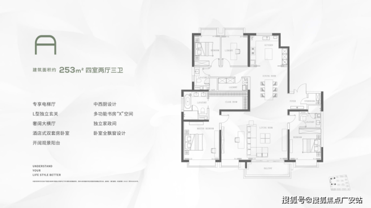 第二,虽然是4房,但是宽绰的超极大横厅完全可以分隔出一间“灵动空间”来,不管是作为书房、瑜伽室还是健身空间,都是极佳的选择。